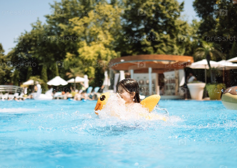 Маленькая девочка с надувным кругом в форме утки прыгает в бассейн