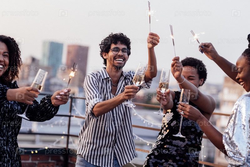 Многонациональная группа молодых людей веселится на вечеринке на крыше. Друзья держат в руках бенгальские огни
