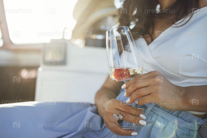 Женская рука держит бокалы шампанского с малиной на борту лодки