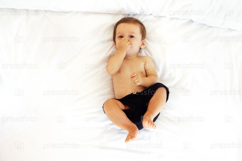 Милый ребенок смеется и лежит на белой простыне на диване