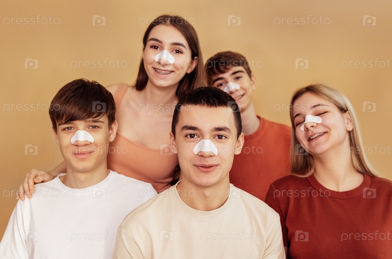 Группа веселых подростков с очищающими полосками на носу для удаления черных точек. Мальчики и девочки заботятся о коже лица. Молодые люди делают косметические процедуры