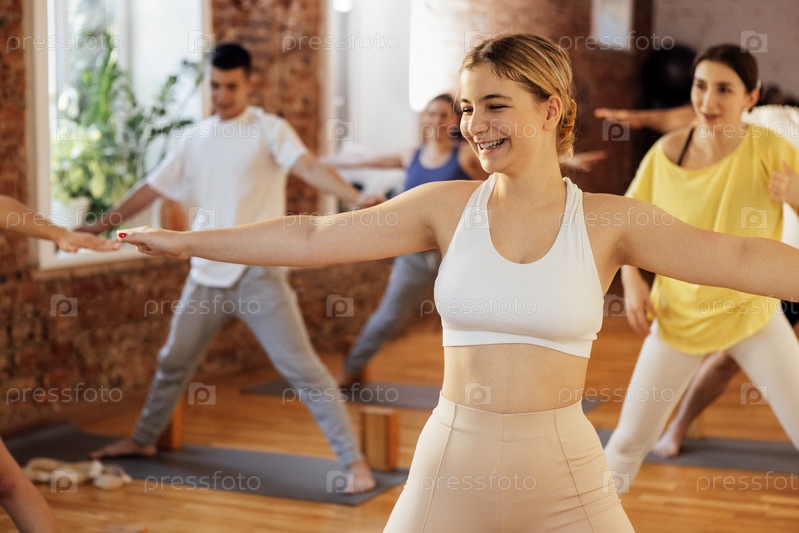 Группа разных людей вместе занимается йогой. Сосредоточьтесь на улыбающейся девушке, стоящей с вытянутыми руками в ряд с коллегами