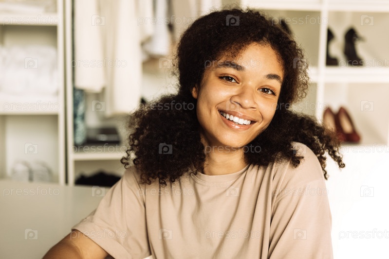 Крупным планом портрет улыбающейся девочки-подростка смешанной расы в домашней раздевалке. В гостиной смеется молодая очаровательная африканка в бежевой футболке