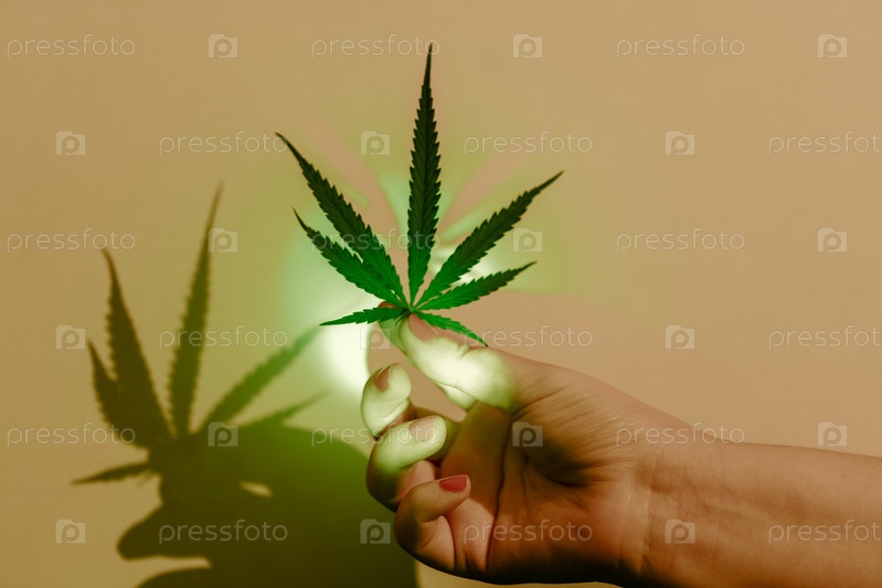Крупный план женской руки с аккуратным маникюром, держащей лист конопли на бежевом фоне. Неоновый свет и жесткая тень. Рука с коноплей