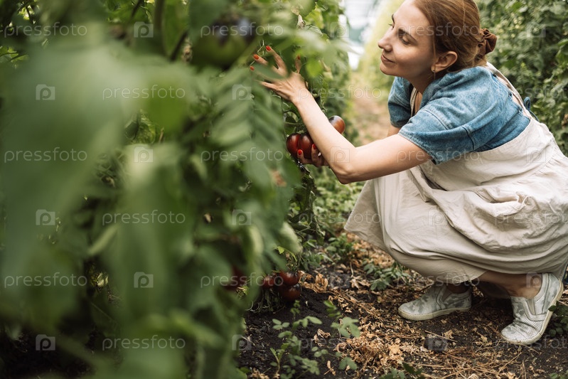 Крупный план молодой привлекательной женщины-фермера, проверяющей спелые плоды черных помидоров