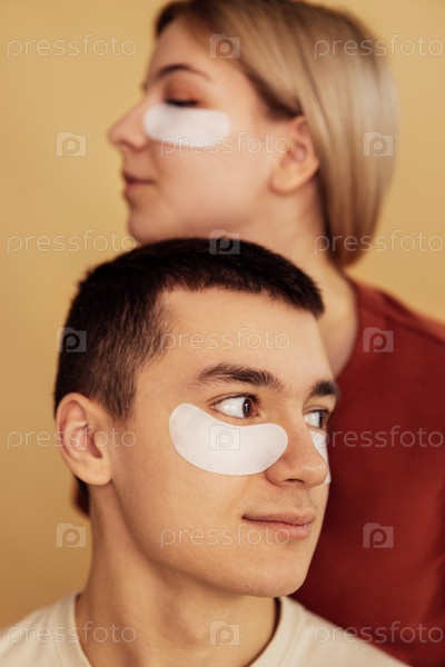 Улыбающаяся пара подростков в профиль с увлажняющими пятнами под глазами. Милая девочка и мальчик ухаживают за кожей лица. Косметическая процедура. Рутина красоты