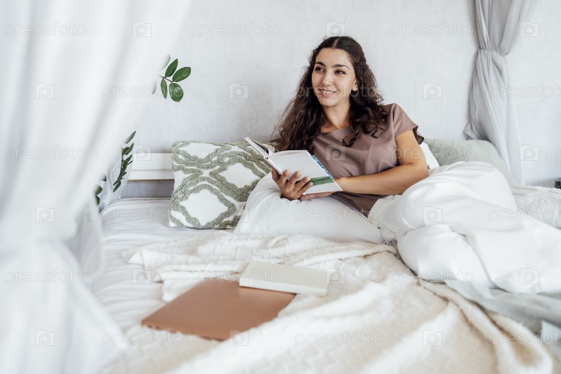 Привлекательная молодая женщина лежит в постели на подушках и читает книгу. Улыбающаяся кудрявая женщина отдыхает на диване в спальне. Современный и уютный интерьер