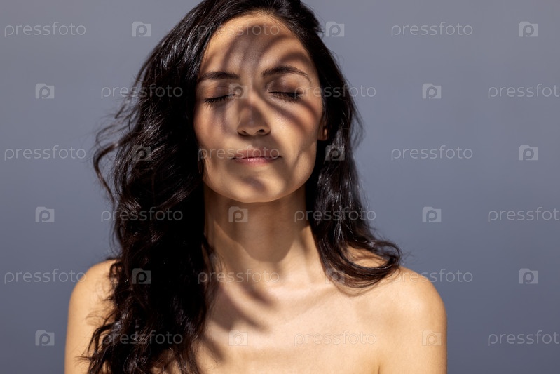 Портрет красоты крупным планом молодой привлекательной женщины с закрытыми глазами и тенью пальмового листа. Красивая брюнетка со здоровой чистой кожей и волосами на сером фоне