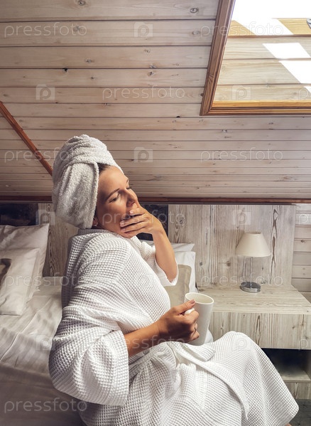 Расслабленная кавказская женщина пьет чай или кофе возле открытого окна в крыше в современном интерьере. Отдых и спа