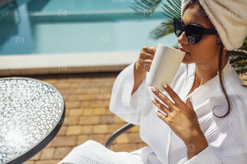 Молодая красивая женщина в белом держит чашку кофе
