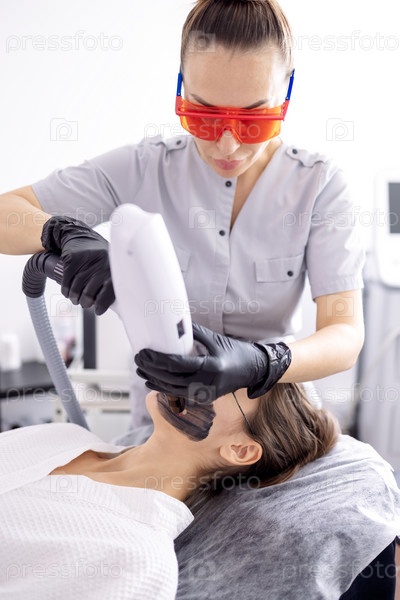 Косметолог держит косметический лазер рядом с лицом женщины, покрытым углеродной маской
