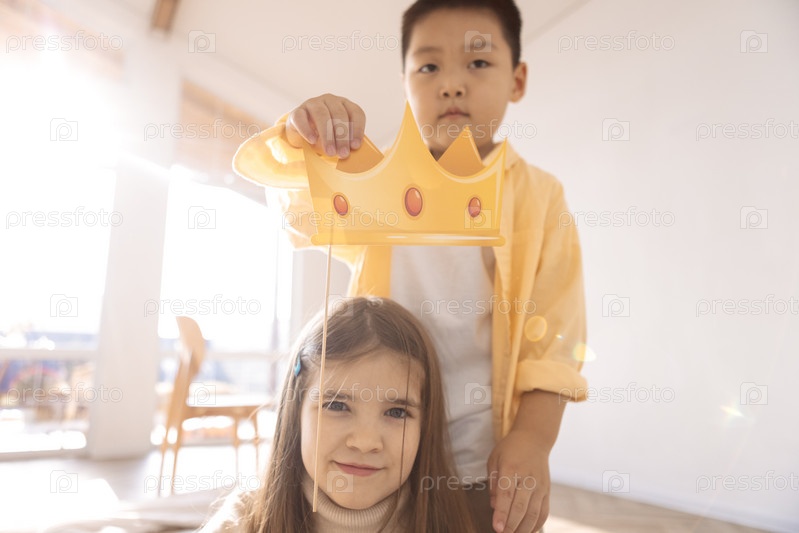 Симпатичные дети разных рас играют вместе. Маленький азиатский мальчик держит бумажную корону над головой белой девушки