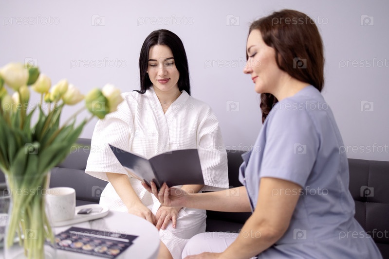 Красивая кавказская косметолог общается со своей клиенткой
