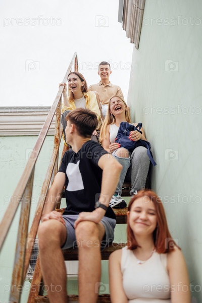 Смешные улыбающиеся подростки в повседневной одежде сидят на металлической лестнице на крыше здания. Милые друзья веселятся вместе