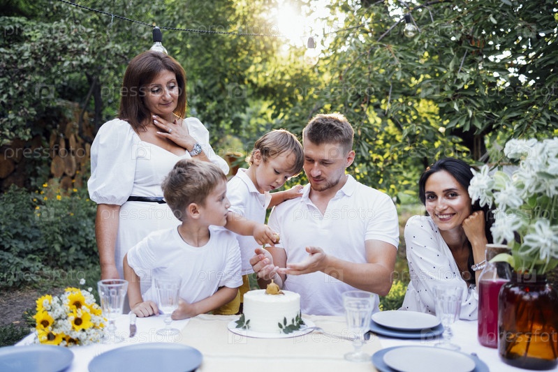 Мама, папа, двое сыновей находятся на открытой веранде дома или в открытом кафе