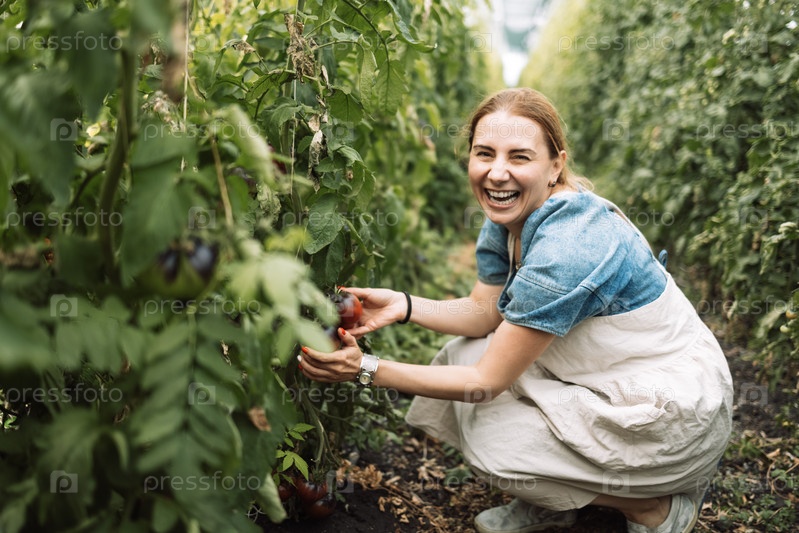 Крупный план молодой привлекательной женщины-фермера, проверяющей спелые плоды черных помидоров