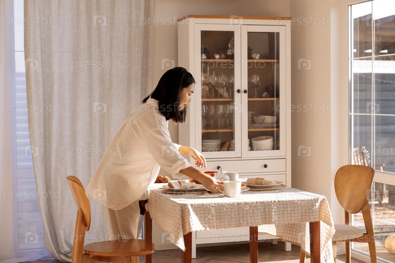 Молодая симпатичная азиатка накрывает на стол в столовой дома. Очаровательная кореянка расставляет тарелки и чашки для семейного завтрака