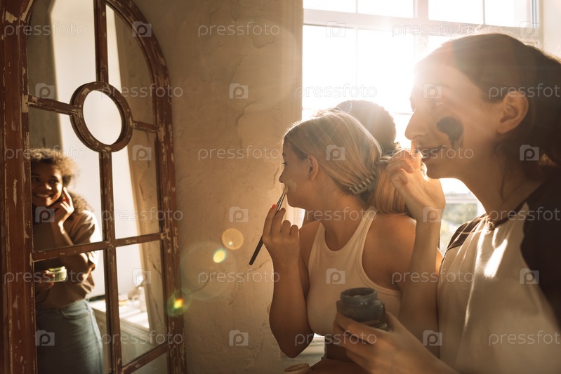 Милые подростки разных рас наносят на лица косметические маски перед зеркалом. Многонациональные подруги заботятся о своей коже. Симпатичные студенты веселятся вместе дома