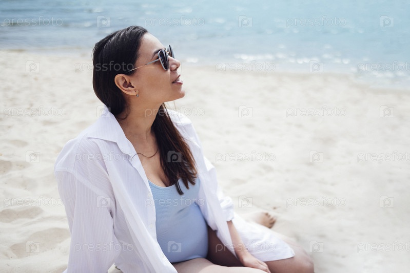 Привлекательная молодая женщина в солнцезащитных очках, купальнике и белой рубашке сидит на песчаном пляже