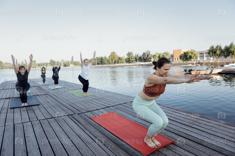 Утреннее занятие йогой с инструктором на городском пирсе. Группа молодых женщин разных рас стоит на стуле на циновках и выполняет Уткатасану. Девушки занимаются растяжкой или пилатесом