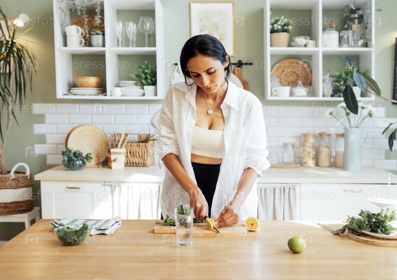 Молодая привлекательная женщина готовит вкусный свежий лимонад и режет лимон и мяту на деревянной подставке. Очаровательная брюнетка-веганка готовит полезный и вкусный завтрак