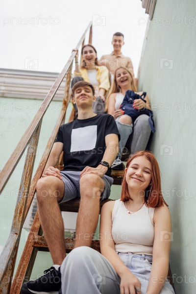 Смешные улыбающиеся подростки в повседневной одежде сидят на металлической лестнице на крыше здания. Милые друзья веселятся вместе. Счастливые девочки и мальчики болтают и смеются на улице