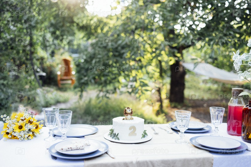 Милый детский праздничный торт с номером два и львенком на праздничном столе на открытом воздухе. Здесь никого нет. Накрытый праздничный стол с цветами, скатертью, тарелками и стаканами в уютном месте на заднем дворе дома