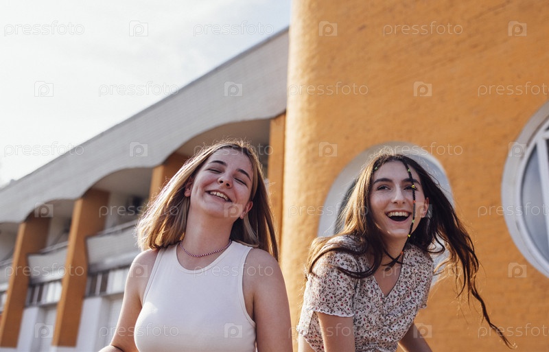 Крупный план двух смеющихся девочек-подростков в повседневной одежде на фоне городского здания