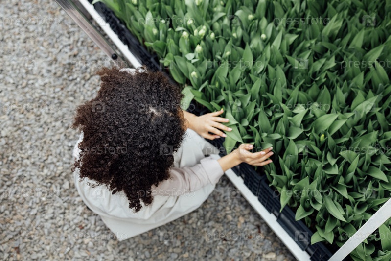Улыбающаяся темнокожая работница теплицы проверяет состояние саженцев