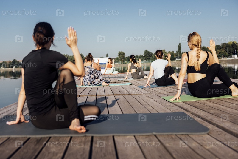 Утренние занятия йогой с инструктором на городском пирсе. Молодые женщины сидят в позе царя рыб и выполняют Ардха Матсиендрасану на берегу реки