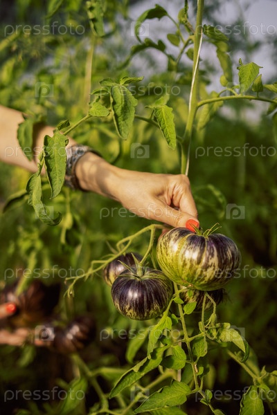 Женские руки с аккуратным маникюром держат сочные зеленые черноплодные помидоры