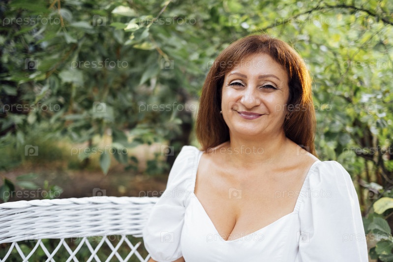 Улыбающаяся кавказская женщина средних лет смотрит в камеру и позирует
