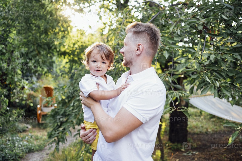 Счастливый папа держит на руках своего милого сына в саду
