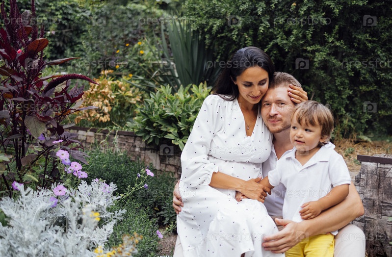Молодая пара и их сын на улице в солнечный летний день