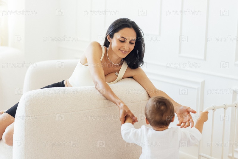 Молодая улыбающаяся женщина веселится со своим маленьким ребенком дома