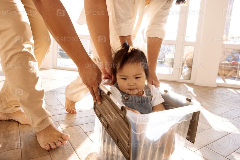 Молодые смеющиеся азиатские родители катают свою дочь в пластиковой коробке по дому