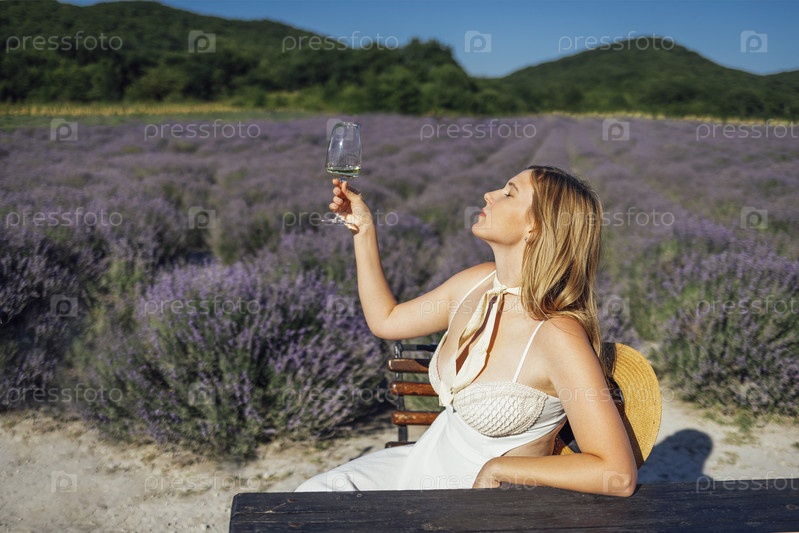 Молодая блондинка в белом платье сидит на стуле среди лавандового поля и держит бокал игристого вина
