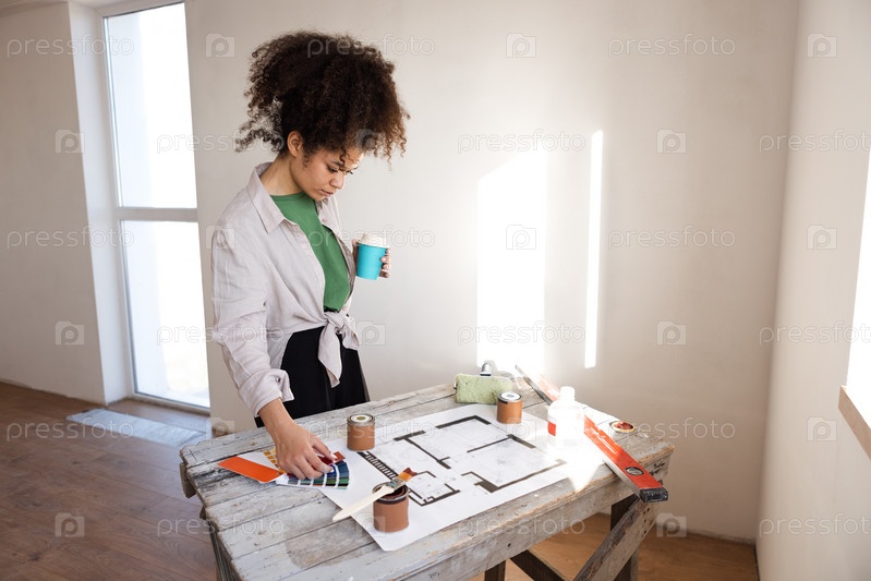 Привлекательная улыбающаяся африканская женщина держит планшет и кофе и проверяет план дома
