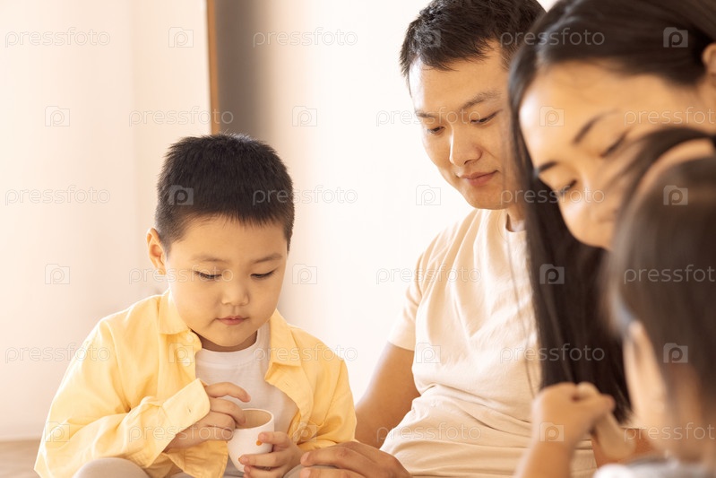 Счастливая азиатская семья. Корейские родители и их милые маленькие дети играют дома с игрушками