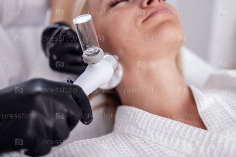 Кавказская женщина проходит процедуру пилинга лица в клинике красоты