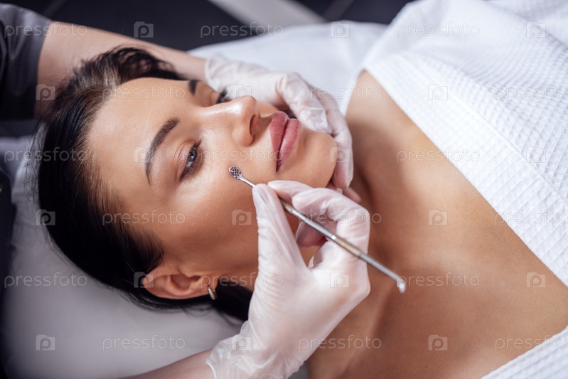 Профессиональный косметолог очищает женщину от прыщей во время процедуры против старения