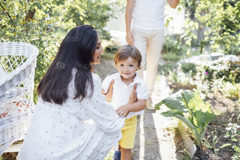 Очаровательная шатенка в белом элегантном платье берет на руки своего маленького сына
