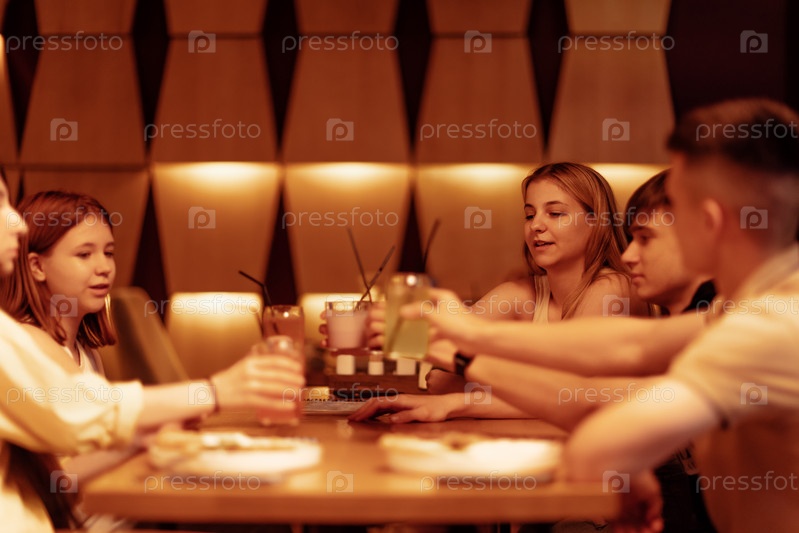 Подростки поднимают праздничный тост с коктейлями в стаканах с трубочками. Друзья приятно проводят время в кафе с современным интерьером