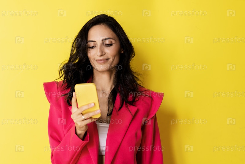 Студийный портрет удивленной молодой брюнетки, смотрящей на свой телефон на ярко-желтой спине