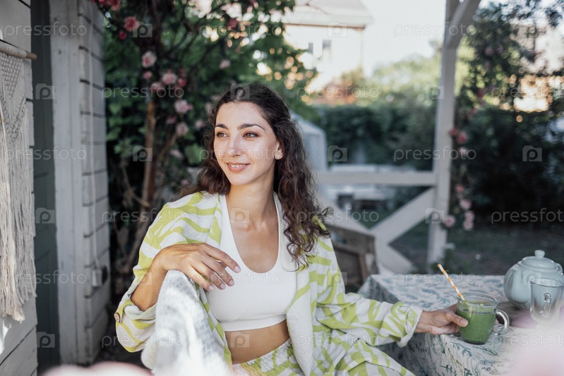 Привлекательная кудрявая девушка в белом топе улыбается и пьет зеленый коктейль из прозрачного стекла. Очаровательная молодая женщина в фитнес-костюме пьет полезный напиток дома. Современная и уютная открытая терраса