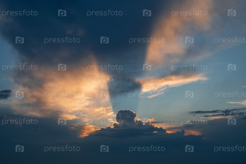 Красивое закатное небо выше с интересной тенью на облаках от солнца