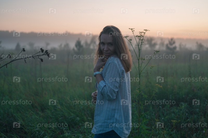 Женщина в поле с туманным туманом