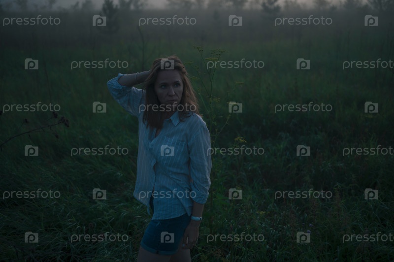Женщина в поле с туманным туманом