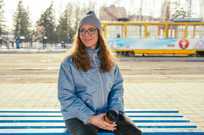 Портрет стильной женщины в синей куртке с чашкой кофе. Весенний портрет на открытом воздухе