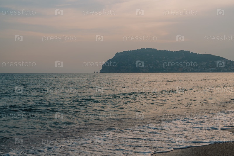 Волны Средиземного моря катятся к песчаному турецкому пляжу. Прекрасный турецкий вечер